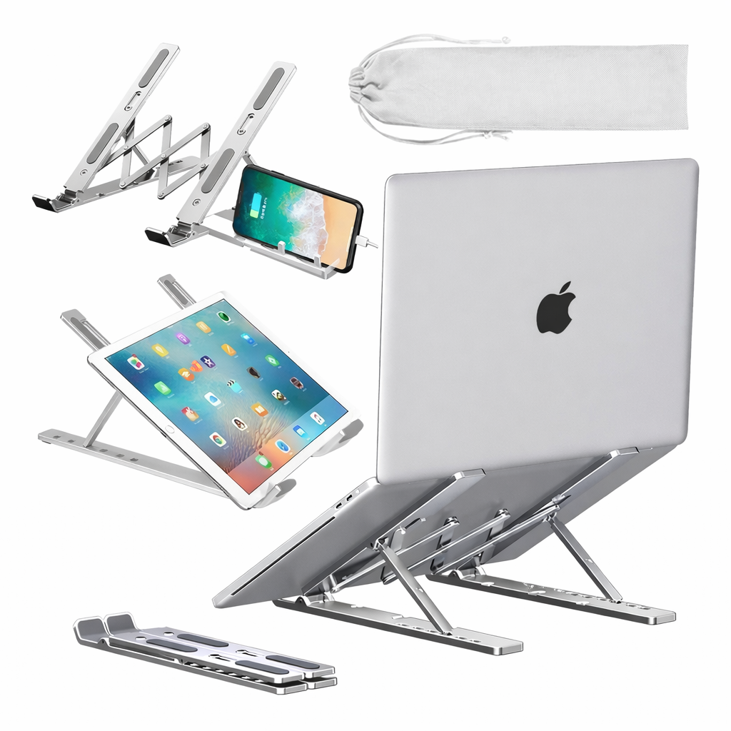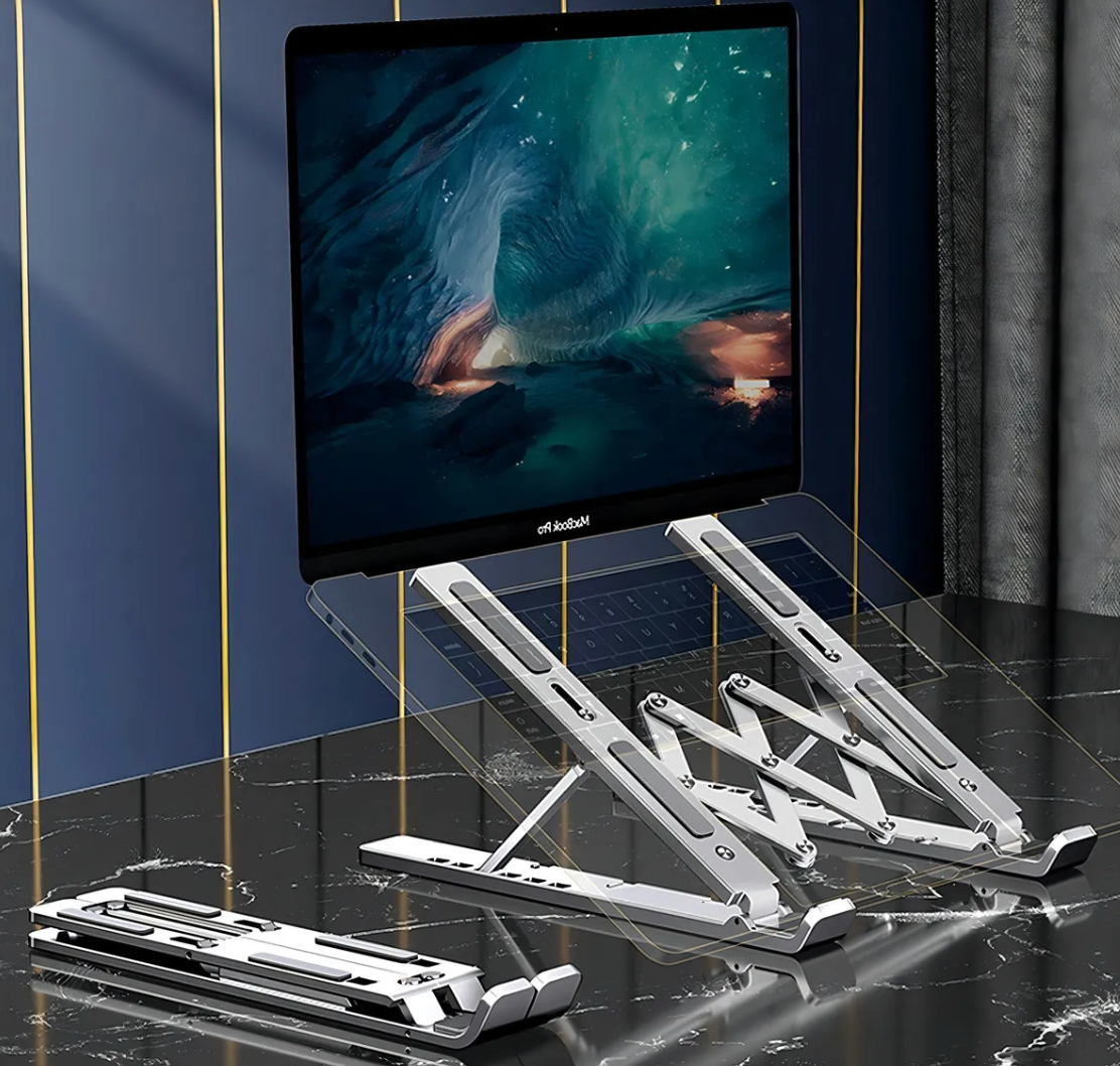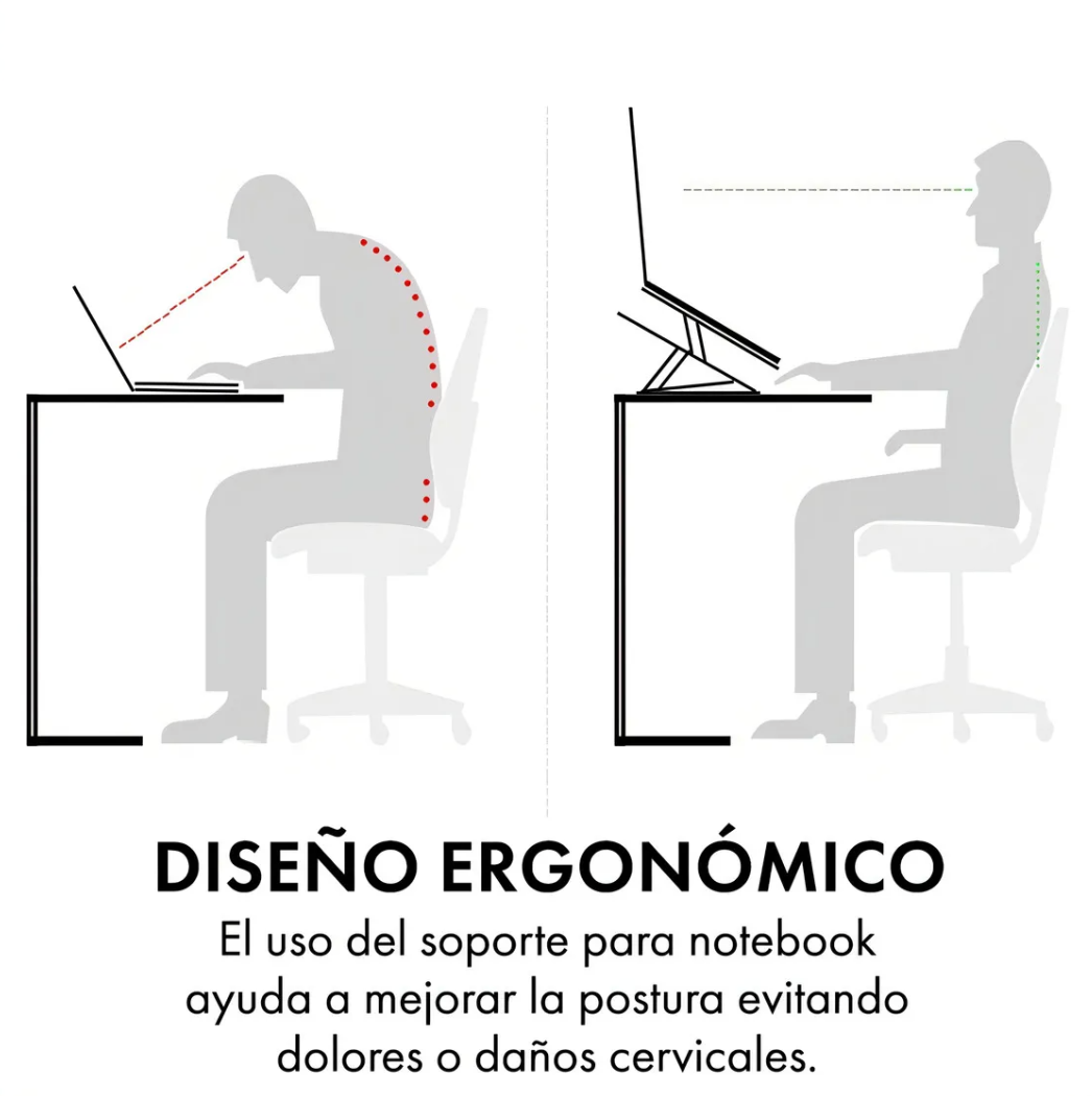 Este Soporte Plegable de Aluminio para Notebook eleva tu pantalla a la altura ideal, ayudando a mejorar la postura y reducir la tensión en cuello y espalda.